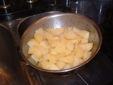 Peel and cut the potatoes into ¾” dice. Bring a large pot of salted water to a boil, add the potatoes and cook over high heat until tender (about 12 minutes.) Test for doneness by poking a piece of potato with a toothpick. The toothpick should pass through the potato without resistance at the center.